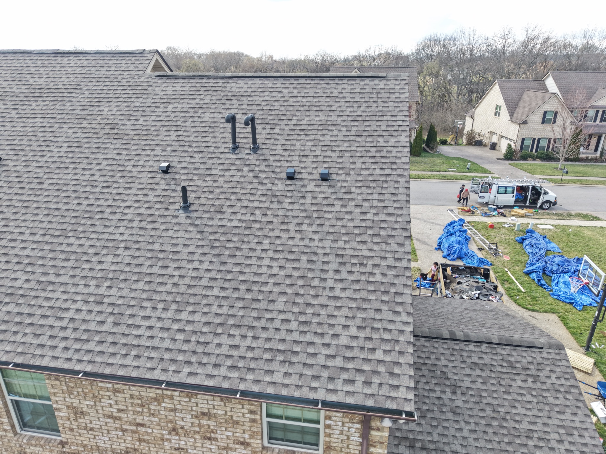 Perform a 0.66 sq roof return at the Franklin property. Crew must protect landscaping and nearby exterior areas throughout the job. Follow all standard site requirements, including bringing a dump trailer, wearing plain shirts, avoiding parking on the grass, using ladder stabilizers, protecting decks, pools, spas, equipment, and A/C units, and removing A/C protection after demo. Install ice and water shield around all roof-to-wall areas, valleys, chimneys, and penetrations. Clean gutters with a blower, install ridge vent on all ridges, leave three squares on the pallet, and complete a full cleanup including blower cleanup, tar/scuff removal, and magnetic nail sweep around the home, landscaping, driveways, and sidewalks.