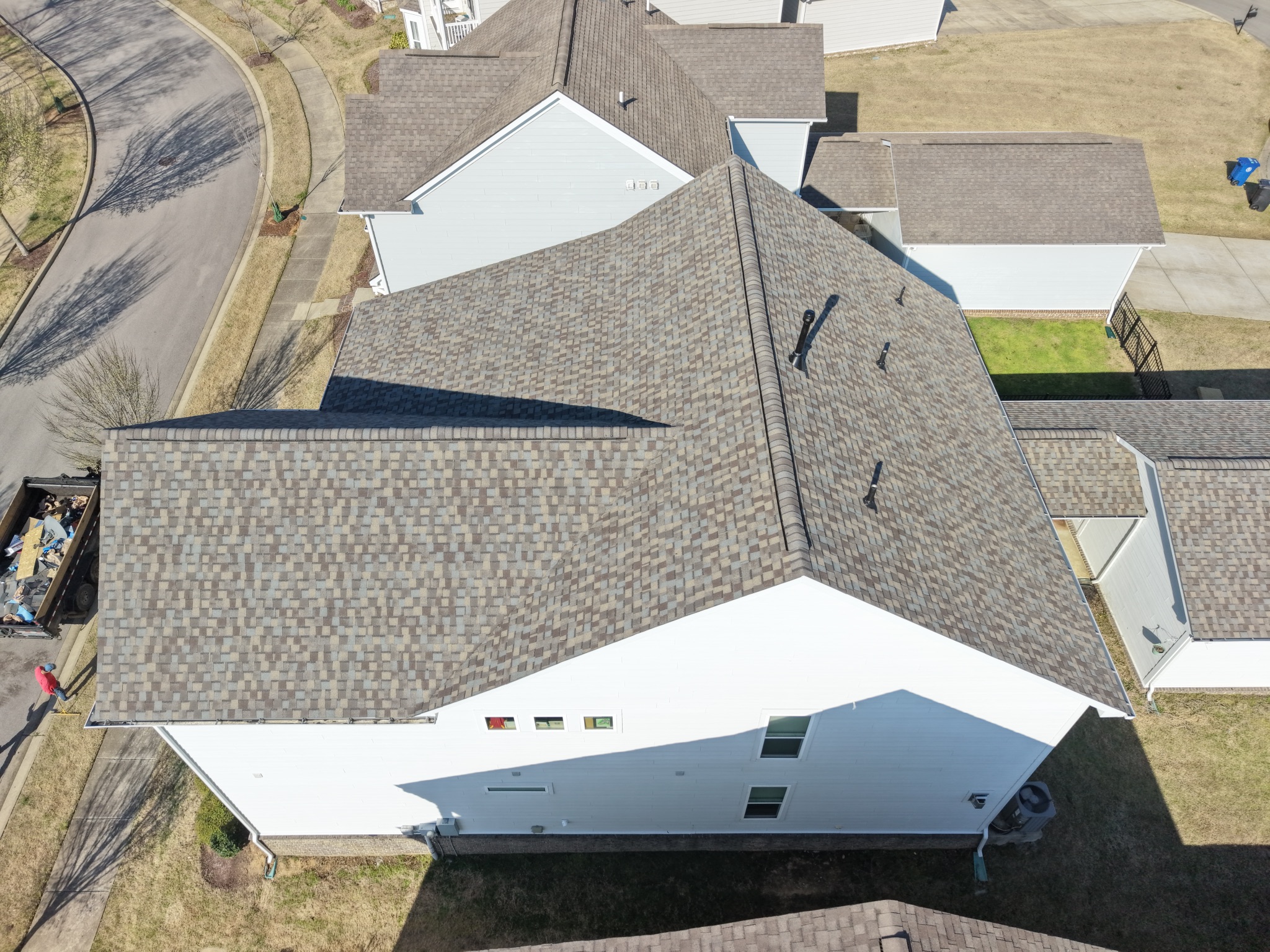 Perform a 4.33-square roof return at the Franklin property. Protect landscaping throughout the job and remove the existing satellite dish. Crew must bring a dump trailer, wear plain shirts, avoid parking on the grass, and protect decks, pools, spas, equipment, and nearby A/C units. Use ladder stabilizers, remove A/C protection after demo, keep all sensitive areas covered during work, install ice and water shield around all roof-to-wall areas, valleys, chimneys, and penetrations, leave three squares on the pallet, clean gutters with a blower, install ridge vent on all ridges, and complete a full cleanup including driveways, walkways, decks, handrails, window seals, scuffs, tar marks, and magnetic nail sweeping around the property.