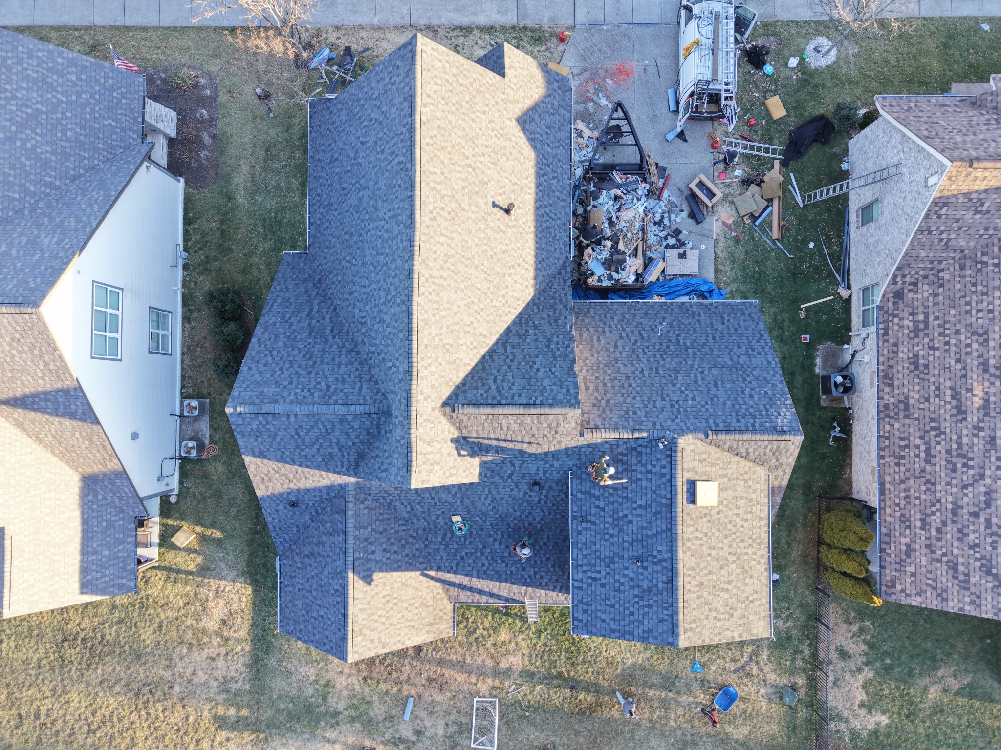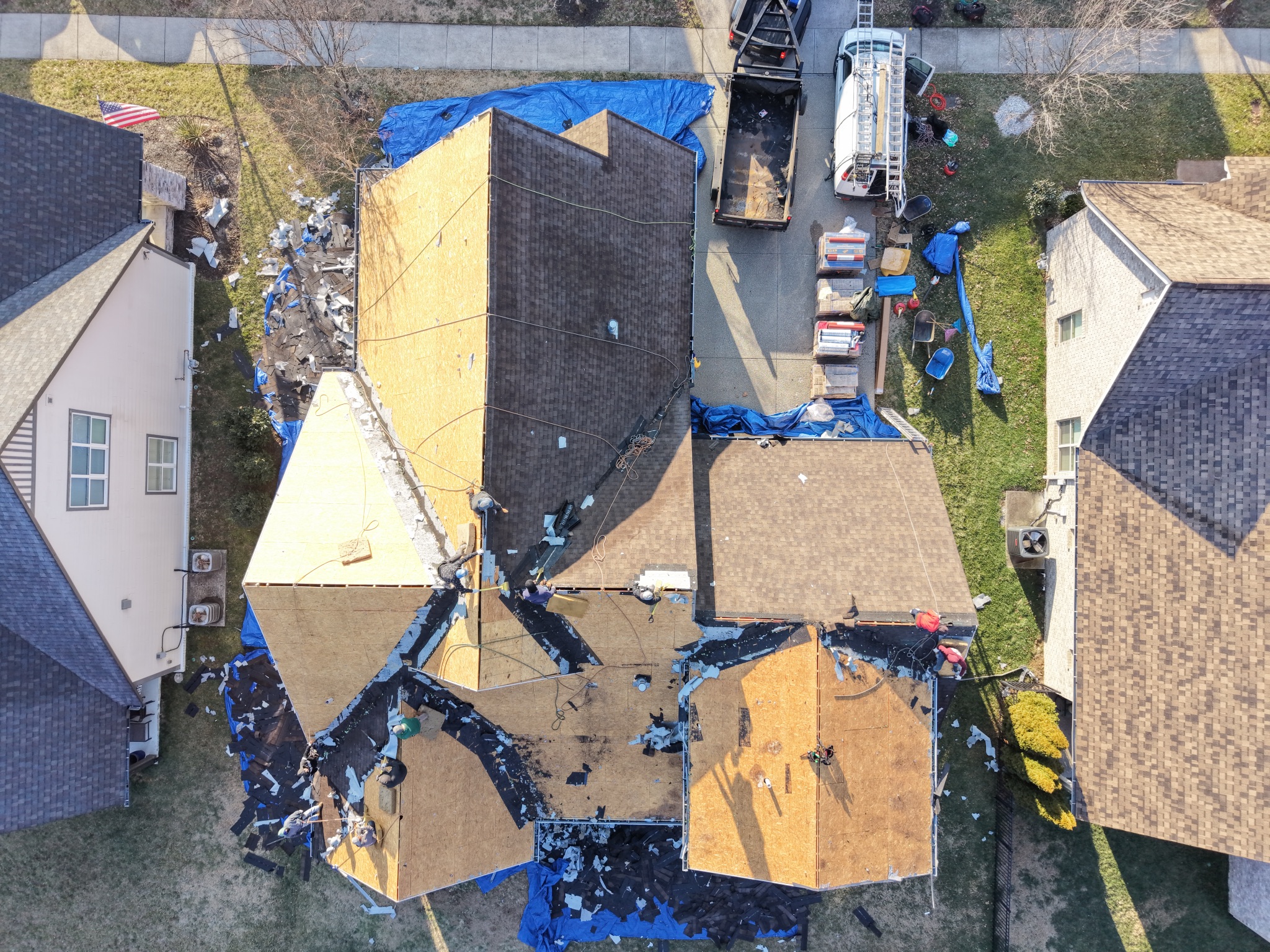 Perform a 2.66 square roof return in Franklin, including full site protection, careful handling around landscaping, decks, pools/spas, and nearby A/C units, plus a thorough nail sweep and final cleanup. Crew must bring a dump trailer, wear plain shirts, avoid parking on grass, use ladder stabilizers, apply ice and water shield at all required penetrations and transitions, clean gutters, install ridge vent on all ridges, and blow and clean all affected exterior surfaces upon completion.