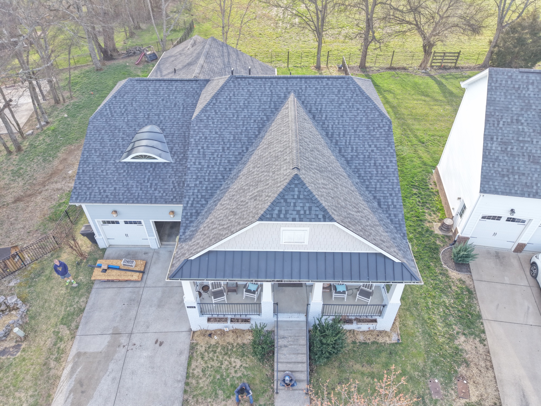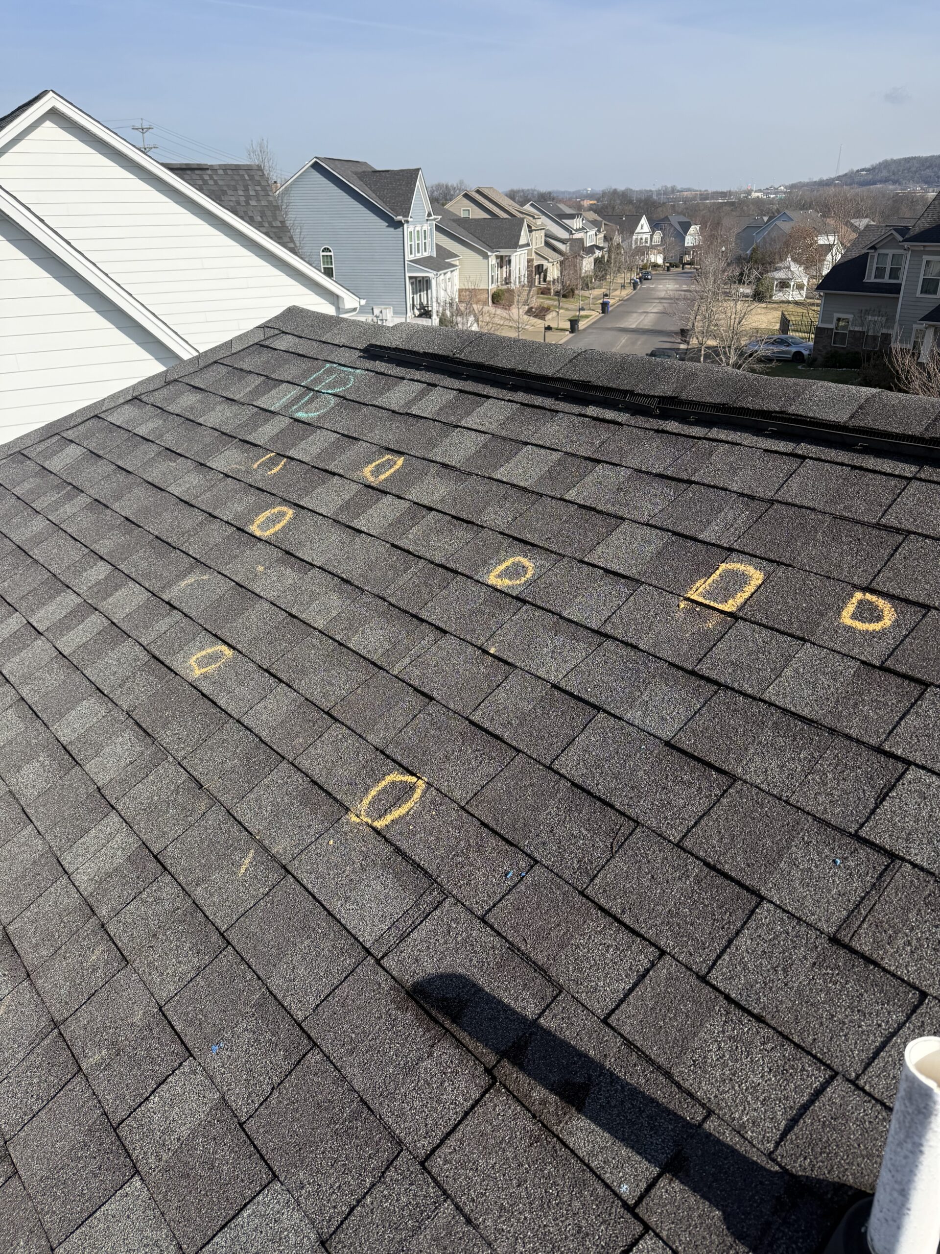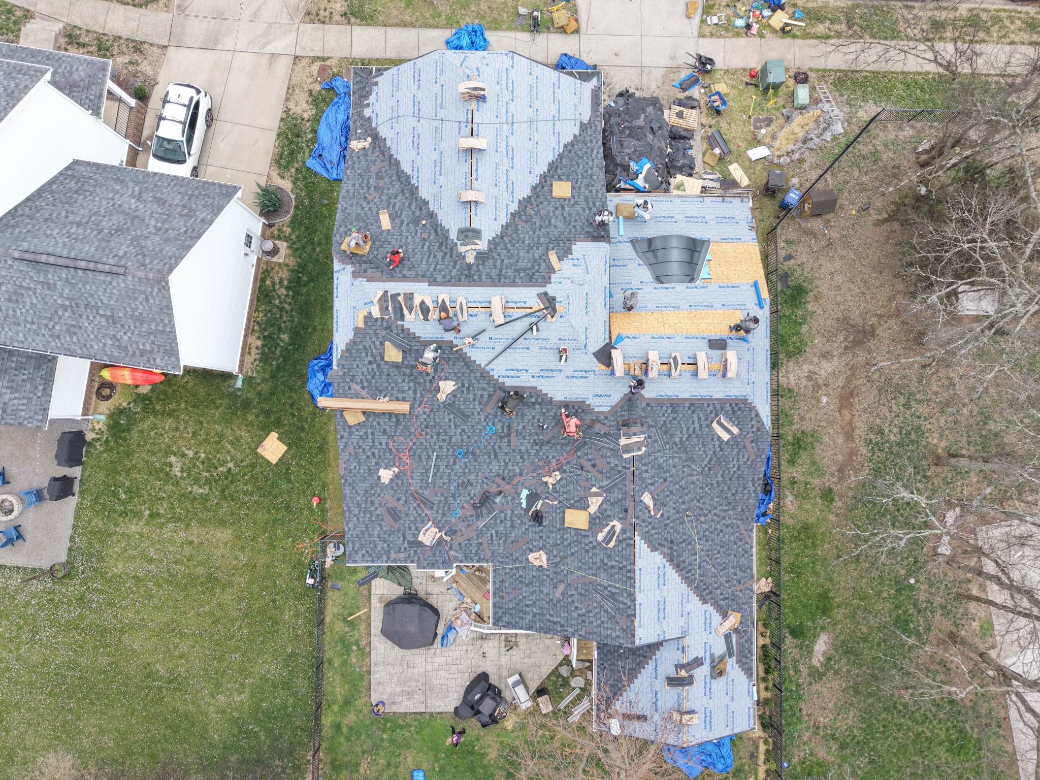 Perform a 1.66 sq roof return in Franklin while protecting front rose bushes, nearby landscaping, decks, pools, spas, equipment, and A/C units. Crew must protect the backyard fish tank with tarp and OSB, remove the satellite dish, and discard gutter guards. Extra attention is required for a thorough nail sweep on the property and next door due to customer dogs that may be let out. Standard jobsite rules apply, including use of ladder stabilizers, ice and water protection at critical areas, ridge vent installation on all ridges, gutter cleaning, surface cleanup, magnetic rolling, and final debris/scuff removal. Crew must bring a dump trailer, wear plain shirts, and avoid parking on the grass.